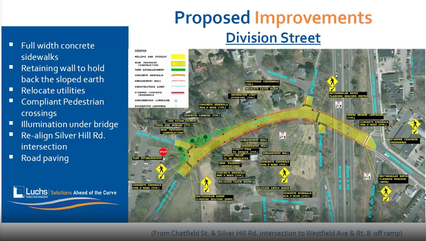 The road will be reconstructed, sidewalks on both sides of the road will be made ADA compliant, pedestrian signs with flashing lights will be installed, a retaining wall will be built, and the intersection of Division Street with Chatfield Street and Silver Hill Road will be realigned.