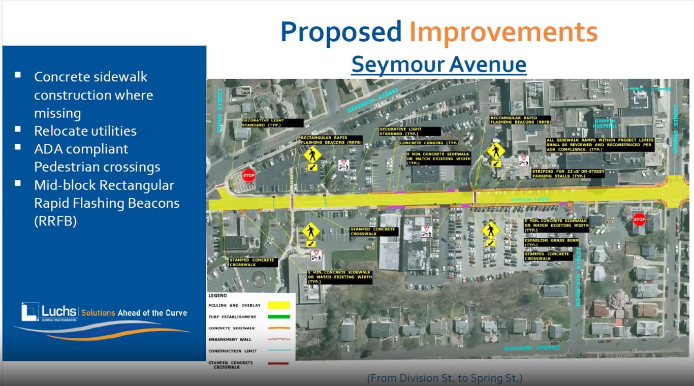 Seymour Avenue from Division to Spring Street will receive new sidewalks, decorative lighting, and safer pedestrian crossings, including the installation of flashing lights to warn motorists of crossing pedestrians.
